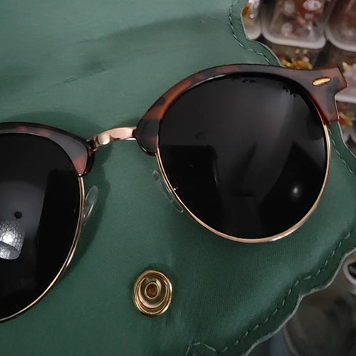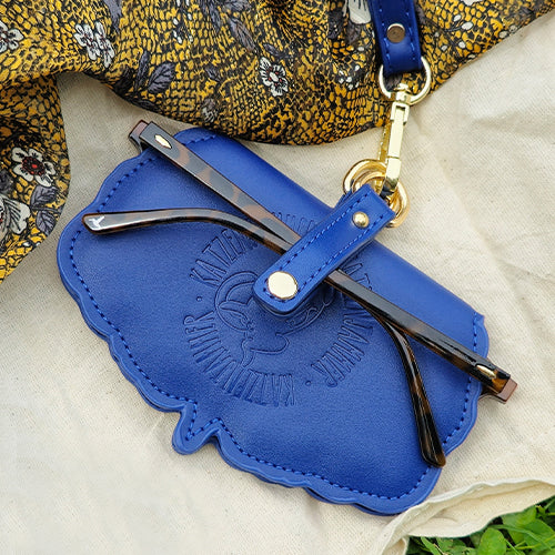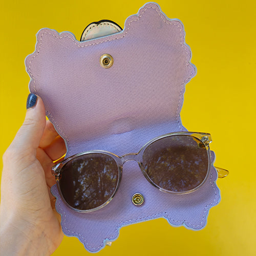 Foldable glasses holder, cool on the outside, soft on the inside. It's attachable to the strap of the ita bag, belts etc. You close the glasses around the holder, it holds tight and safe thanks to a button rivet.